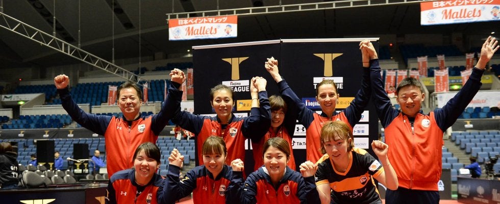 写真:前列左から野村萌、森薗美咲、安藤みなみ、ソ ヒョウォン。後列左から渡辺理貴コーチ、ハン イン、鈴木李茄、エリザベタ サマラ、新井周監督(トップおとめピンポンズ名古屋)/提供:©T.LEAGUE