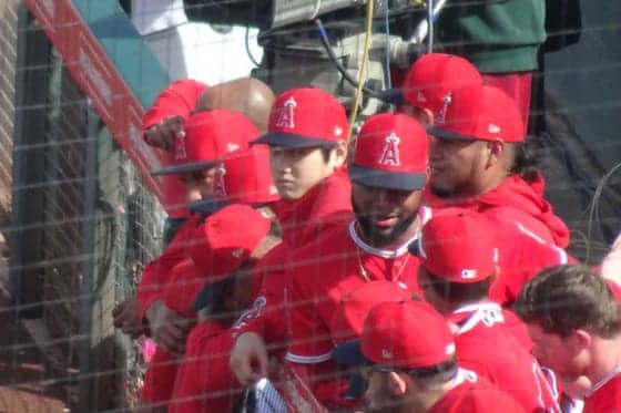 ダグアウトから試合を観戦したエンゼルス・大谷翔平【写真:盆子原浩二】