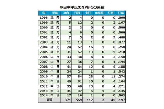 小田氏は1997年ドラフト4位で巨人入り。05年12月にFAで巨人に移籍した野口茂樹投手の人的補償として中日に移籍した。主に控え捕手として通算17年間で371試合出場、打率.197、2本塁打、45打点を記録。ニックネームは「ODA(オーディーエー)」。愛嬌のあるキャラクターでファンからの人気が高かった。(Full-Count編集部)