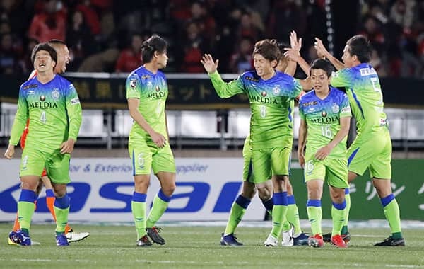 開幕戦で札幌に勝利し、ハイタッチを交わす湘南イレブン