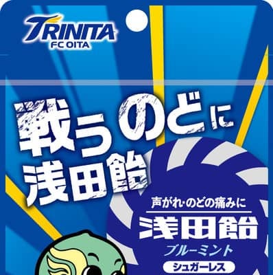 「戦うのどに浅田飴」は、チームカラーの「青」をイメージしたブルーミント味のシュガーレスドロップ剤だ。大分トリニータ公式キャラクターである「ニータン」のオリジナルパッケージを採用しており、売上の一部がチームの強化費に充てられる。
