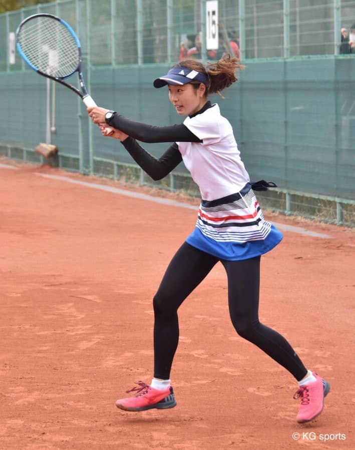 <写真・ストレート勝ちで3回戦進出を決めた明河> 3月3日、大阪府万博テニスガーデンにおいて、平成30年度関西学生新進テ…