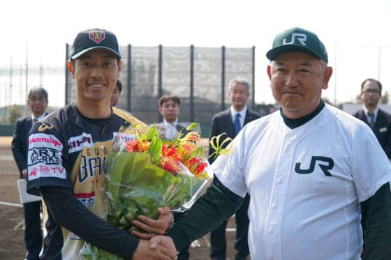 出身の社会人JR東日本とオープン戦で初タクト 試合前には電光掲示選手名ボード除幕式に出席 昨季限りで巨人を引退し、今季か…