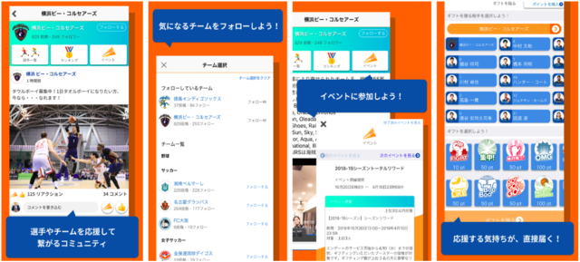 ファンはギフトやコメントを投稿することで、応援する気持ちをチームや選手に直接届けられ、チームと一緒にコミュニティの中にいる事が実感できる。また、チームが開催するイベントに参加したり、コメントを相互に投稿することが無料で可能だ。