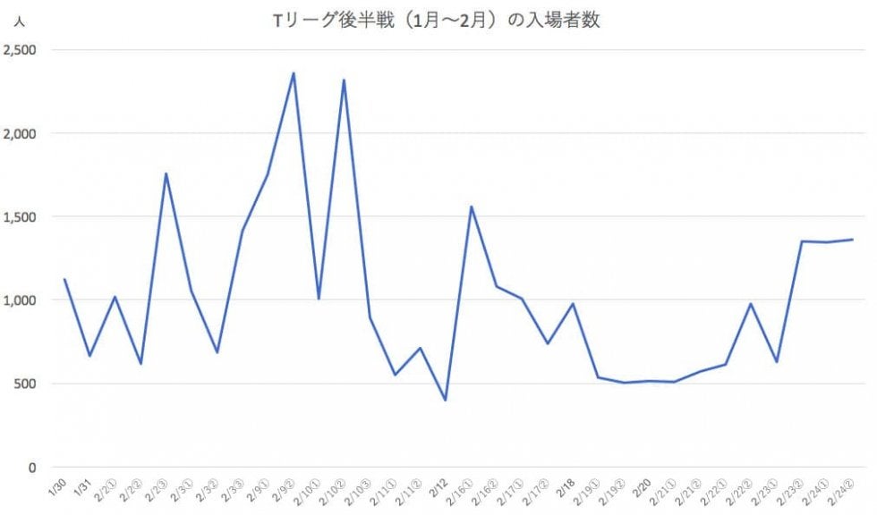 写真:Tリーグ後半戦(1月・2月)の入場者数推移/図:ラリーズ編集部