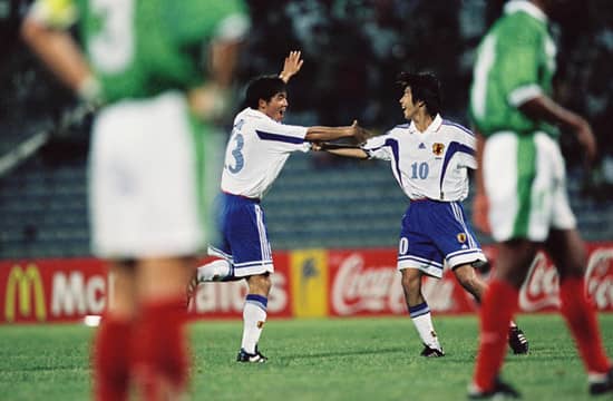 メキシコ戦でゴールを決めて歓喜する小野伸二。右は本山雅志。photo by Yanagawa Go