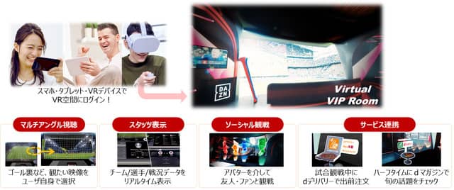 「docomo Sports VR powered by DAZN」は、アプリをダウンロードしたスマートフォンやタブレット、VRデバイスを使用して、スポーツ観戦のライブ、アーカイブをVR空間内のバーチャルVIPルームで楽しめるサービスだ。マルチアングルでの視聴、リアルタイムに更新される試合情報(スタッツ)を閲覧しながらの観戦、アバターを使って友人と会話しながら観戦体験共有ができるソーシャル観戦機能等、さまざまな機能を使ったスポーツ観戦が楽しめる。