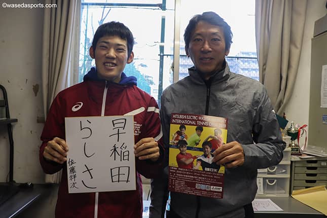 最終回を飾る第6回に登場していただいたのは、昨年度から早大庭球部のヘッドコーチ並びに三菱電機・早稲田大学インターナショナルオープン(早稲田オープン)のトーナメントディレクターを務める石井弥起ヘッドコーチと、昨年の大会を統括として成功に導いた佐藤祥次(スポ3=大分舞鶴)のお二人。トーナメントディレクター、前統括というこれまでとは少し異なる立場から早大庭球部が今大会を運営する意義や、世界を見据えた早大庭球部としての考え方、そして大会の魅力に迫った。