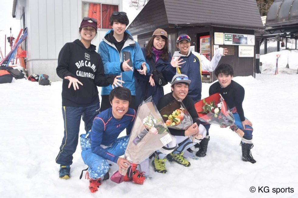 <写真・試合後写真撮影に応じる4年生たち> 3月10日、長野県野沢温泉スキー場にて第89回全関西学生スキー選手権大会の…