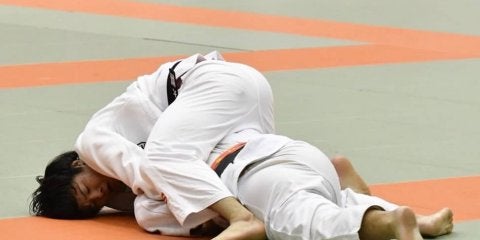 <写真・寝技で相手を抑える川村> 3月10日、グリーンアリーナ神戸にて、第15回KOBE自他共栄CUP(学生柔道大会)…
