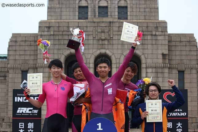 そして、学校対抗が争われるクラス1。各大学の応援部による応援もあり、盛り上がりは最高潮に達した。早大からはRCS第11戦終了時点で年間総合優勝を確定させていた孫崎のほか、中川と小野寛斗(スポ2=神奈川・横浜)の二人が出走した。早大勢はスタートから集団の上位に付いてレースを展開していく。時折、逃げる選手が現れたものの、その度に集団に吸収され、勝負はラストスプリントに懸かることとなった。最終コーナーを回り、勢いよく飛び出したのは沢田桂太郎(日大)。孫崎は懸命に後を追ったがわずかに及ばず、2位でフィニッシュラインを通過した。さらに中川が4位に入り、早大は学校対抗優勝をつかんだ。学生最後のレースで孫崎を勝たせたいという後輩の思いが勝利を引き寄せたのだった。