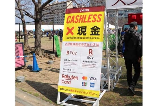 スタジアム前の屋台広場には大きくキャッシュレスを伝える看板も設置された【写真:(C)PLM】