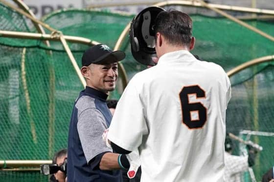 試合前にイチローへ挨拶をした巨人・坂本勇人(右)【写真:Getty Images】