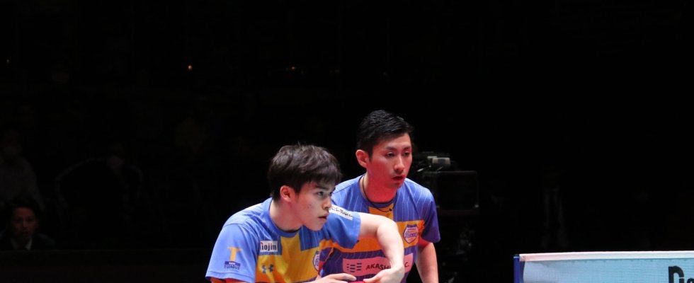 17日、卓球新リーグ・ノジマTリーグの年間王者決定戦「プレーオフファイナル」が幕を開けた。男子はレギュラーシーズン首位の木下マイスター東京(以下、KM東京)と2位の岡山リベッツ(以下、岡山)が対戦し、第1マッチのダブルスを岡山が制した。