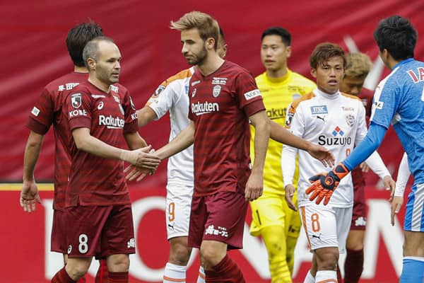 日本デビューとなったセルジ・サンペールと握手をかわずアンドレス・イニエスタ(ヴィッセル神戸)