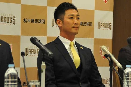 昨季限りで阪神を戦力外となり、ルートインBCリーグの栃木ゴールデンブレーブスへの入団が決まった西岡剛内野手が18日、栃木・小山市内で入団会見を行った。元巨人の寺内崇幸監督、栃木GBの古後昌彦会長と会見に臨んだ西岡。ネイビーのスーツ、白のシャツ、古後会長と寺内監督と揃いのゴールデンブレーブスカラーのネクタイを締め「監督が緊張していてたのか噛んでいたので僕も緊張してきました。この機会をいただいたエイジェック、栃木県民球団に感謝したいと思います」とまず、語った。