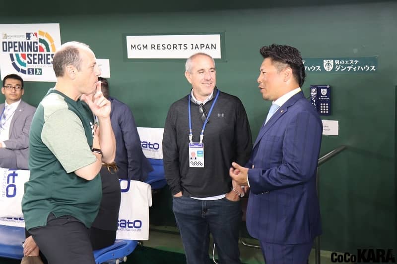 アスレチックス時代のスタッフと久しぶりに再会し談笑する岩村さん