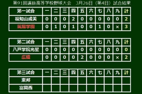 第91回選抜高校野球は26日、兵庫・西宮市の阪神甲子園球場で大会4日目第2試合が行われ、広陵(広島)が八戸学院光星(青森)に2-0で勝利。広陵のエース河野が3安打8奪三振の完封で勝利を導いた。