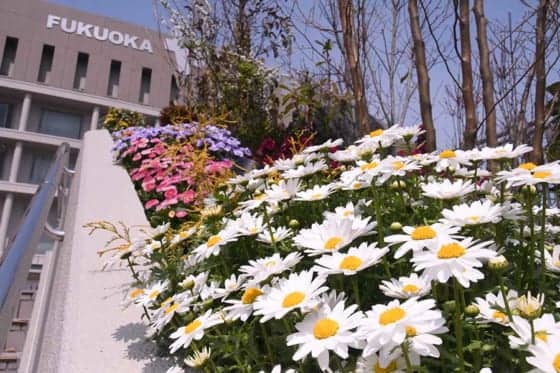 ヤフオクドームの玄関口ともいえる5ゲート前の大階段。その両サイドが季節の花々で彩られたステップガーデンとして生まれ変わった。さらに東側と西側の大階段の間はグリーンティングガーデンとして季節ごとの花で「SoftBankHAWKS」のロゴを表現される。