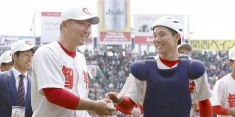 大勝で初戦を突破し、東妻(右)からウイニングボールを受け取る智弁和歌山の中谷監督=甲子園【写真提供=共同通信】 平成最後…