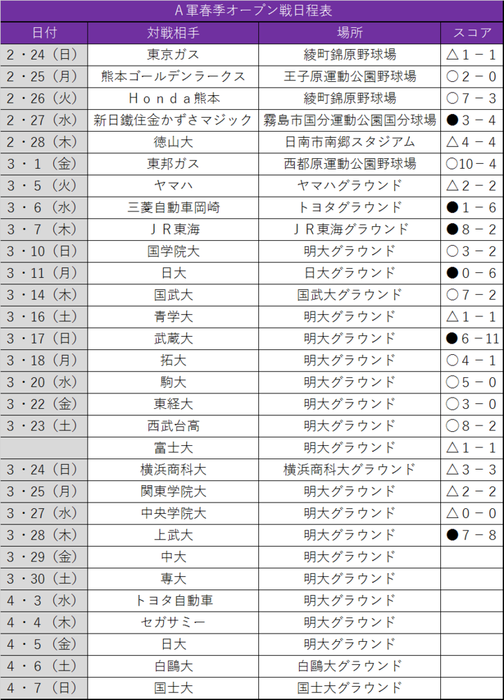 大量失点が重く響いた。先発・竹田祐投手(政経1=履正社)、2番手・石毛力斗投手(文2=健大高崎)は昨秋に好成績を残し、今春も活躍が期待される中心投手。しかし、この日は竹田が3失点、無死満塁から登板した石毛が押し出しを含む5失点と不安の残る結果に。特に石毛はピンチでの救援が主戦場であるだけに、開幕までの復調が望まれる。