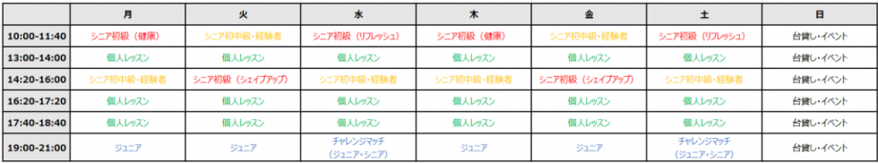 写真:琉球アスティーダ卓球スクールの時間割(予定)/提供:琉球アスティーダスポーツクラブ株式会社