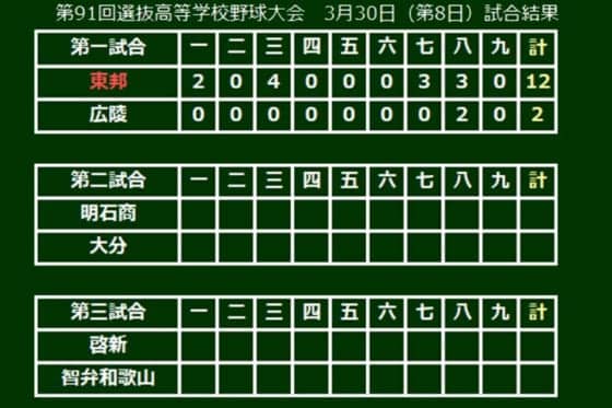 第91回選抜高校野球は30日の大会8日目、第1試合が行われ、東邦(愛知)が春4度目Vを目指した広陵(広島)を投打で圧倒し、12-2で勝利。ベスト8進出を決めた。