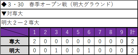 東都リーグに所属する専大と対戦。明大は7安打を放つも打線がつながらず、2―2の引き分けに終わった。