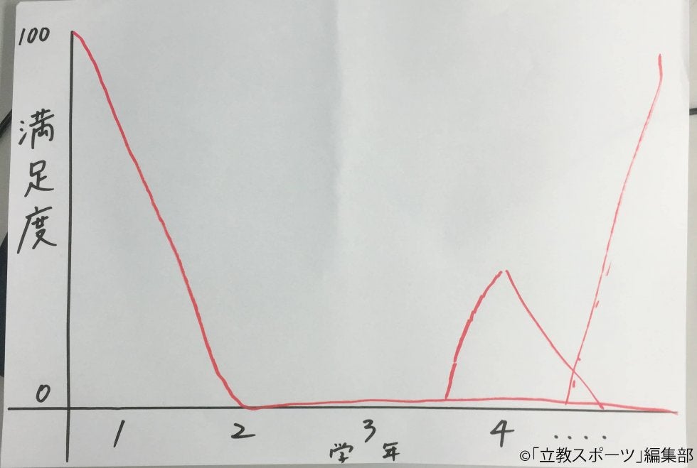 近藤直筆の「4年間満足度グラフ」。希望に満ちあふれた1年次、出場機会に恵まれない2・3年次、自分たちの代になり出場できるようになった3年次後期から4年次初期、怪我に悩んだ四年次の変遷を描いた。未来の自分は、期待を込めて右肩上がりに