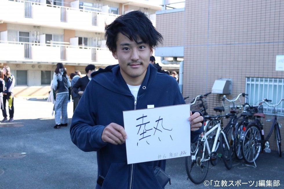 熊田はプレー面以外でも謙虚な選手だった。4年の秋季開幕戦、熊田のゴールが決勝点となり、のちに起こる2部優勝への勢いをつけた。そんな中でも背番号6は「良かったのは点を決められただけで、全体としては自分として課題の残る試合だった」と決して驕ることなく、冷静に試合を分析するほど。「あなたにとってホッケーとは?」という質問に対して熊田は「自分を熱くさせてもらえるものですね」と照れ臭そうに答えてみせた。随所随所に謙虚さが滲み出ている男だった。