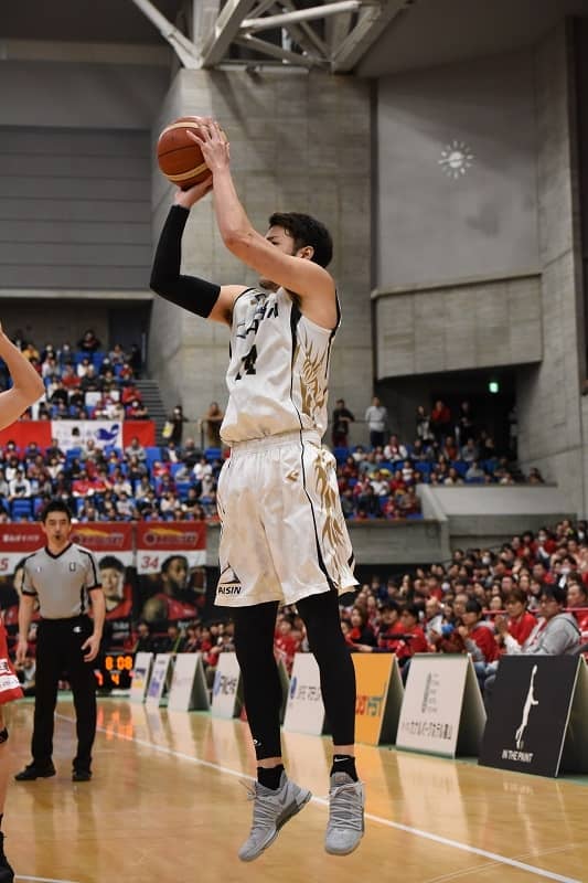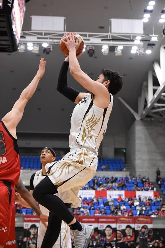富山#25葛原の3Pシュートで逆転されるも、すぐに#14金丸が反転してフェイダウェイ、バスケットカウントの連続得点でリードを奪い返す。#4狩俣、#24加藤がハードなディフェンスで富山の勢いを削ぐと、#32桜木を起点に多彩なオフェンスを展開。#5バッツがゴール下、#32桜木のポストアップ、#14金丸がタフシュートをねじ込んで点差を広げる。残り1分には#14金丸が20得点目となる3Pシュートを射抜いて、B1個人通算3Pシュート300回を達成した。