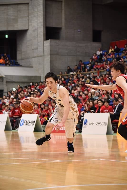富山#34スミス、#0ライオンズ、#6船生の得点などで何度も6点差まで迫られるも、その度に#14金丸の3Pシュート、#30岡田のドライブで跳ね返す。