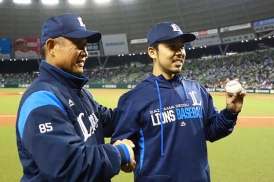 西武・辻発彦監督と初勝利を挙げた西武・本田圭佑(左から)【写真:荒川祐史】