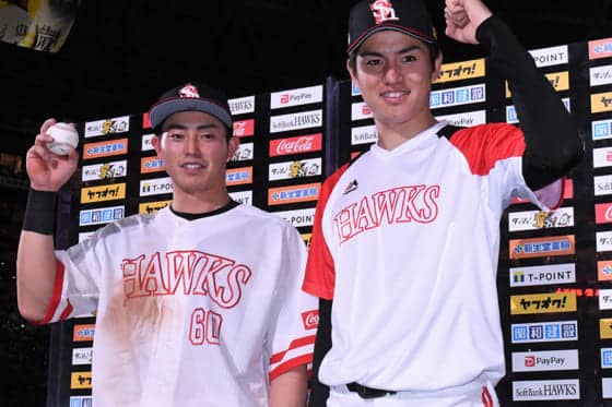 7日のロッテとの試合後お立ち台に立ったソフトバンク・釜元豪(左)と高橋礼【写真:藤浦一都】
