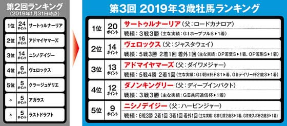 4位は、3位アドマイヤマーズに初めて土をつけたダノンキングリーが圏外から一気にランクイン。サートゥルナーリアと同じく、3戦無敗でクラシックへと駒を進める。