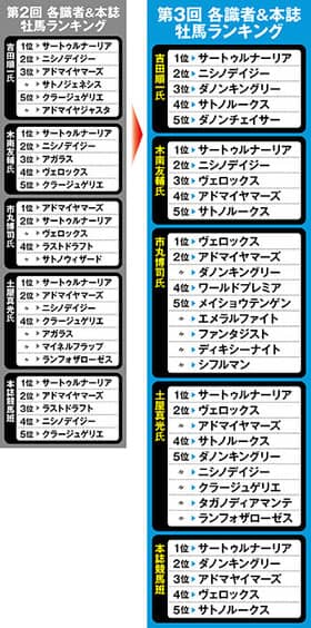 ※『Sportivaオリジナル番付』とは、デイリー馬三郎の吉田順一記者、日刊スポーツの木南友輔記者、独特なデータを駆使するパソコン競馬ライターの市丸博司氏、フリーライターの土屋真光氏、Sportiva編集部競馬班の5者それぞれが、今春のクラシックに挑む3歳牡馬の、現時点における実力・能力を分析しランク付け。さらに、そのランキングの1位を5点、2位を4点、3位を3点、4位を2点、5位を1点として、総合ポイントを集計したもの。