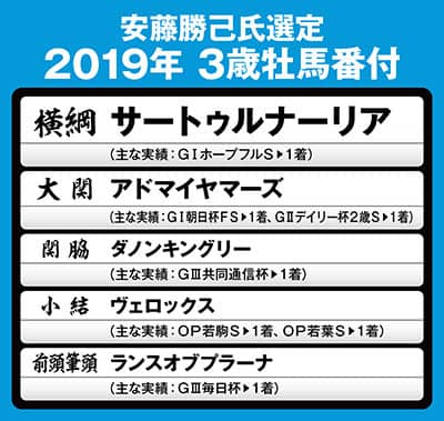 ということで、今回も競走馬の分析に長(た)けた元ジョッキーの安藤勝己氏に3歳牡馬の実力診断を依頼。間近に迫った皐月賞、さらには競馬界最高峰の舞台となる日本ダービー(5月26日/東京・芝2400m)に向けて、どの馬が有望か検証してもらい、独自の視点による「3歳牡馬番付」を選定してもらった――。