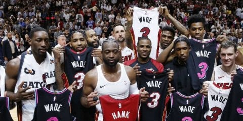 試合後には、今シーズンの恒例となっているジャージー交換を行い、ブルズ時代にチームメートだったジミー・バトラーとジャージーを交換。そして、チームメート全員もウェイドのジャージーを手に持ち記念撮影し、2003年からヒート一筋のキャリアを送るユドニス・ハズレム、長男のザイールともジャージーを交換した、