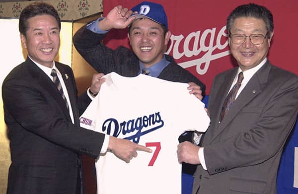 2001年。谷繁元信がFAで中日に入団。その左で笑顔を見せる山田久志。