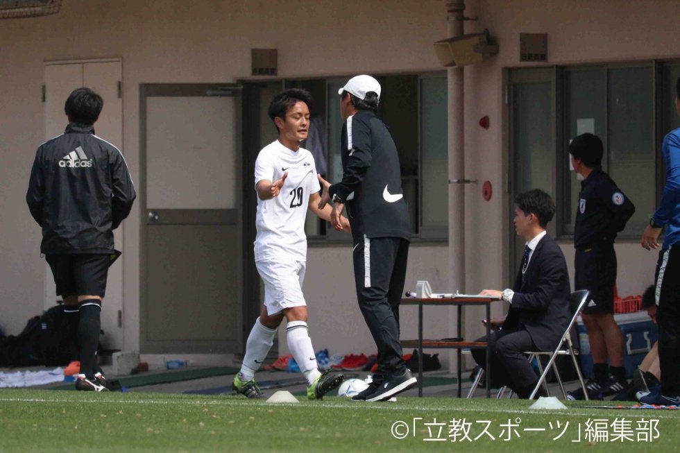 そんな状況でも、就任5年目の倉又監督は冷静にチームを分析し、ハーフタイムで修正を施した。FC東京や日体大で監督を歴任し“倉さん”の愛称で選手から慕われている名伯楽は、桐(コ2=日大藤沢)・奥谷を使った左サイドからの攻撃に勝機を見出す。そこに大塚・武智ら中盤の選手を絡ませることにより、厚みのある攻撃を狙った。