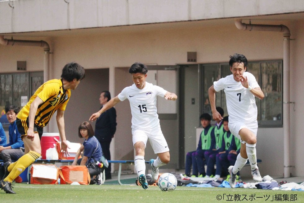 この日も序盤から184㌢の長身FW・宮倉(法2=川越東)をターゲットにロングボールを多用したが、宮倉は空中戦で苦戦を強いられる。攻撃の起点となる吉田(コ4=JFAアカデミー福島)、大塚(営3=前橋育英)も相手の素早いプレスに苦しみ、なかなか決定機を演出できずにいた。CBでコンビを組んだゲームキャプテン・井浦(済4=東久留米総合)と菅原(コ3=横浜FC・Y)、豊富な運動量が持ち味のSB・堀ら守備陣は集中力を高く保ち大崩れすることはなかったが、最終ラインからのビルドアップ(※)で連携ミスが多発。ヒヤリとする場面も多く見られた。