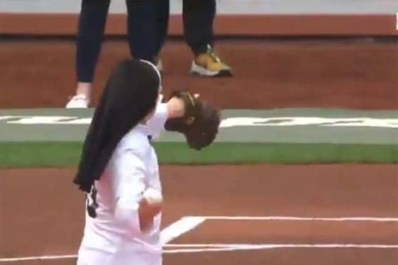 【動画】「なんというキャノン!」とファン再驚愕 伝説の“スーパー修道女”が再び始球式に登場!