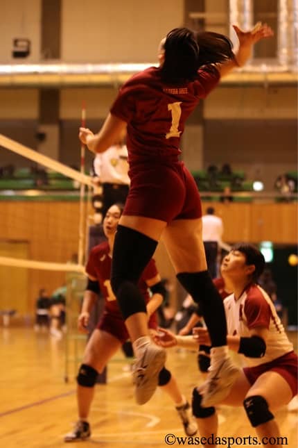 そして迎えた第2セット、期待の新星・中澤恵(スポ1=大阪・金襴会)の強烈なスパイクを皮切りに、中澤と山下日和(社1=千葉・市立船橋)の1年生コンビが、このセット奪った得点の約半分を稼ぐ快進撃を見せる。強化してきた守備でも河治えみり(社3=北海道・旭川実業)を中心に『粘り』が生まれ、第2セットも連取。第3セットに入っても、早大は主導権を渡さない。快進撃を続ける1年生コンビに正確なトスを供給し続けてきた橋本美久(社2=福島・郡山女大附)は2本のサービスエースを決め、自らも得点を奪う。最後は中澤の3連続ポイントで試合を締め、ストレート勝ちを収めた。