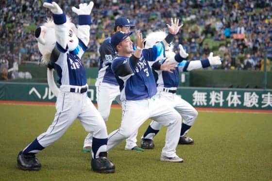 レフトスタンドのファンと一緒に「どすこい」ポーズを披露する西武・山川穂高【写真:荒川祐史】