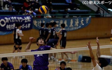 連勝に調子づく明大、4戦目は今季から1部リーグに浮上した専大と対戦した。第1セット、序盤のサーブミスなどが響き、格下相手…