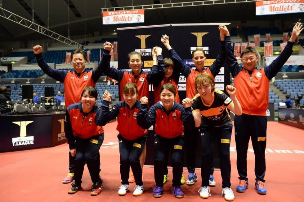 写真:森薗美咲(前列左から2番目)とTOP名古屋のメンバー/提供:©T.LEAGUE