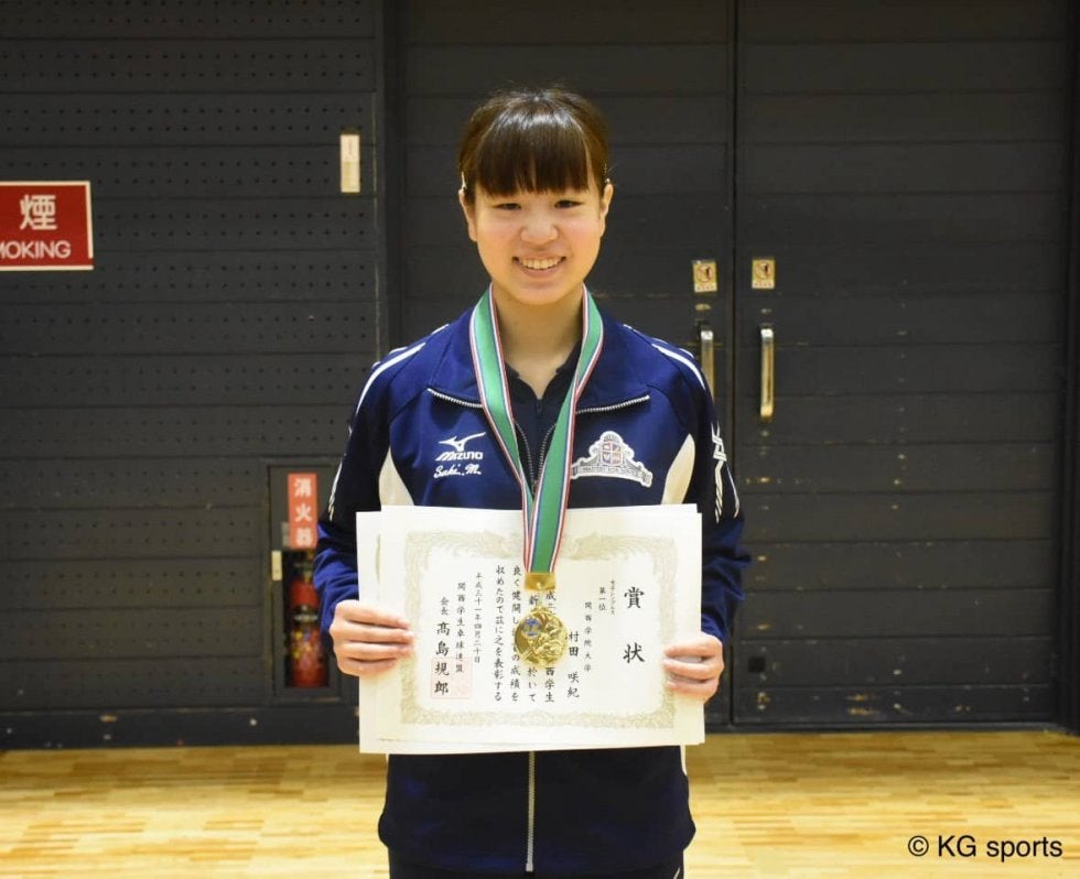 女子シングルスで優勝を果たした村田咲紀「全体的に調子は良くなかったが、その中で調整してプレーすることができた。短い巻き込みサーブで先手を取れたことが勝利につながったと思う。優勝だけを狙って戦ったので、本当に良かった。来週からはリーグ戦が始まるので、1年生らしく堂々としたプレーでチームを盛り上げたい。シングルス、ダブルスを2本取りして、優勝できるように頑張る」