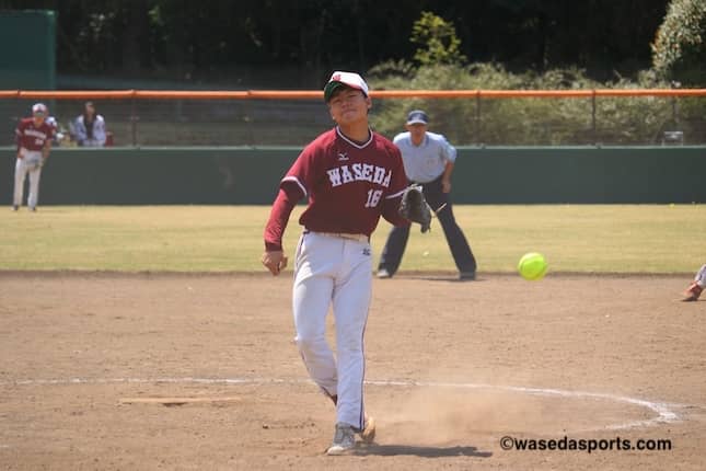 山内も2回以降は立ち直り、国士舘打線に得点を許さない投球。「内野の守備にダブルプレーで助けられた」と山内が話した通り、野手陣も堅い守りで2回と5回に併殺を完成させるなど、山内を盛り立てた。リードを2点に広げて迎えた6回表の守備。早大にとってこの試合最大のヤマ場を迎える。連打と四球で無死満塁から犠飛で1点差に詰め寄られ、さらに1死二、三塁という場面。一打同点・さらには逆転もあり得るという状況でも、チームに動揺はなかった。まずは八番打者を三振に取る。次打者には四球を与えて2死満塁となるが、一番打者を左飛に抑えて、この大ピンチを脱した。するとその裏、山内の粘りに打者陣が応える。1死二塁から澤が今日2本目となる中前適時打を放ち、貴重な追加点を奪うと、続く高橋尚希(スポ3=宮城・泉館山)の遊撃適時内野安打で点差を3点に広げて、勝負あり。最終回もマウンドに上がった山内が、最後の打者を今日3つ目となる併殺打に打ち取り試合を締めた。