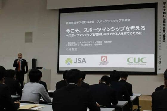 新潟県高校野球連盟は、4月18日、新潟市内でスポーツマンシップ講演会を行った。この日の午前には、春季県大会の組み合わせ抽選会が行われ、県内から連盟所属高校の野球部指導者が集まったが、これら指導者を対象に午後からはスポーツマンシップ講演会が行われた。