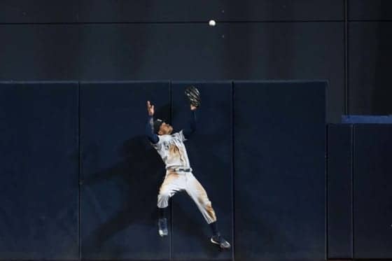 23日(日本時間24日)の敵地パドレス戦。2-4とマリナーズ2点ビハインドで迎えた6回2死二塁の場面で、パドレスのヘッジスの大飛球がセンターに飛んだ。俊足のスミスが背走し、絶妙なタイミングでジャンプ。打球はグラブに収まったかに見えたが……。大きく弾んで、なんとフェンスの反対側に。ホームランを“献上”したスミスは倒れ込んで頭を抱えた。